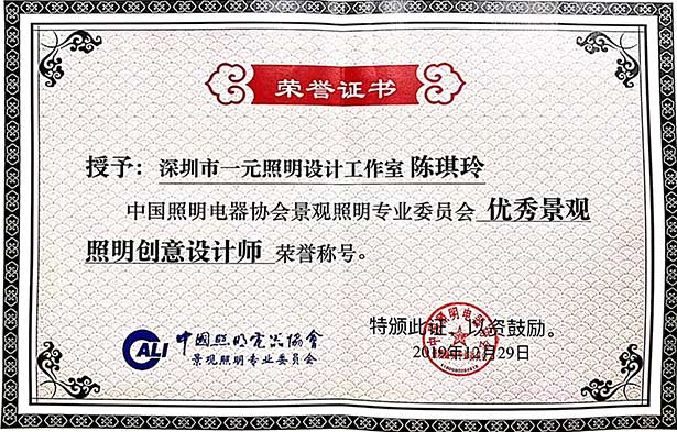 獲優(yōu)秀景觀照明創(chuàng)意設(shè)計師榮譽
